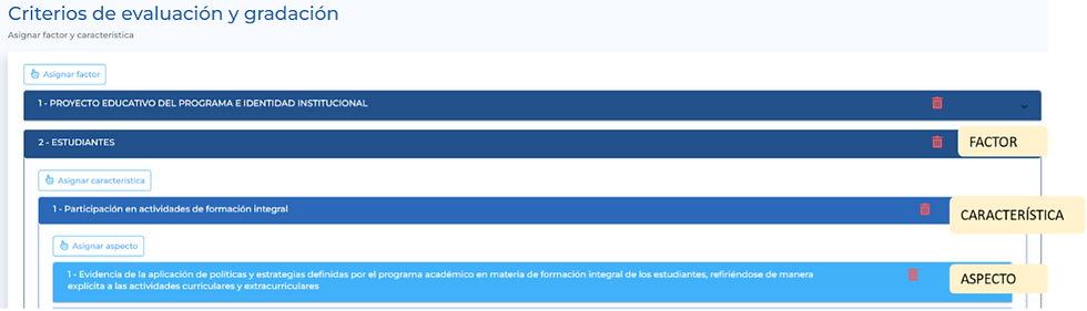 Al hacer clic en el ícono de papelera que aparece en rojo se pueden eliminar los factores, características o aspectos. Si se eliminan las características, se eliminan los aspectos que contenga. Si se eliminan los factores, se eliminan las características que contengan y, a su vez, los aspectos de cada una de ellas.