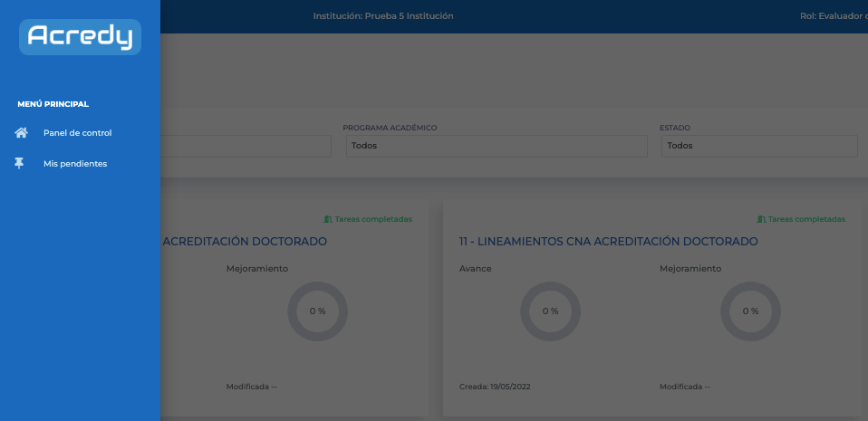 Al iniciar sesión, se despliega el Panel de control. El panel cuenta en la parte superior con una serie de filtros que permiten hallar la evaluación que se requiere de forma más fácil.