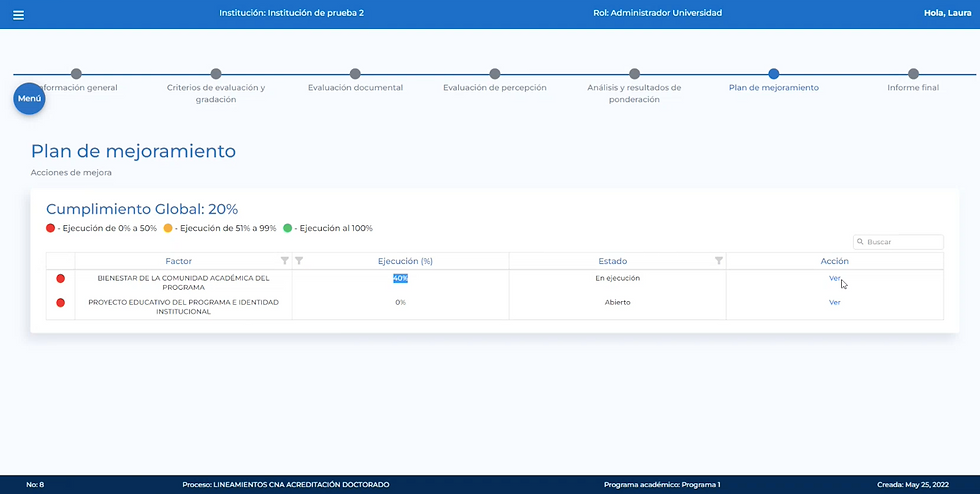 Independientemente del nivel en el que se está trabajando, en la primera pantalla aparecerá el listado de factores que tienen acciones de mejora asociadas, su porcentaje de ejecución y el cumplimiento global del Plan de mejoramiento.