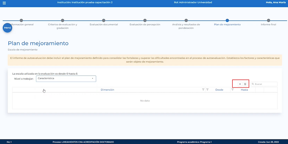 En esta pantalla, el responsable de mejoramiento debe definir las dimensiones y el nivel en el que desea trabajar.
