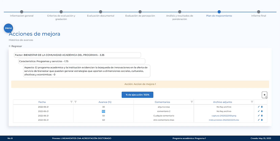En histórico de avances se muestra la información del factor, la característica y el aspecto, dependiendo del nivel de trabajo de la acción. Con la información de la calificación, la acción de mejora a la que se esté consultando, porcentaje de ejecución y una tabla con el histórico de avances creado. La tabla muestra la fecha de creación, el porcentaje de avance, los comentarios realizados y archivos adjuntos que haya sido necesario cargar.